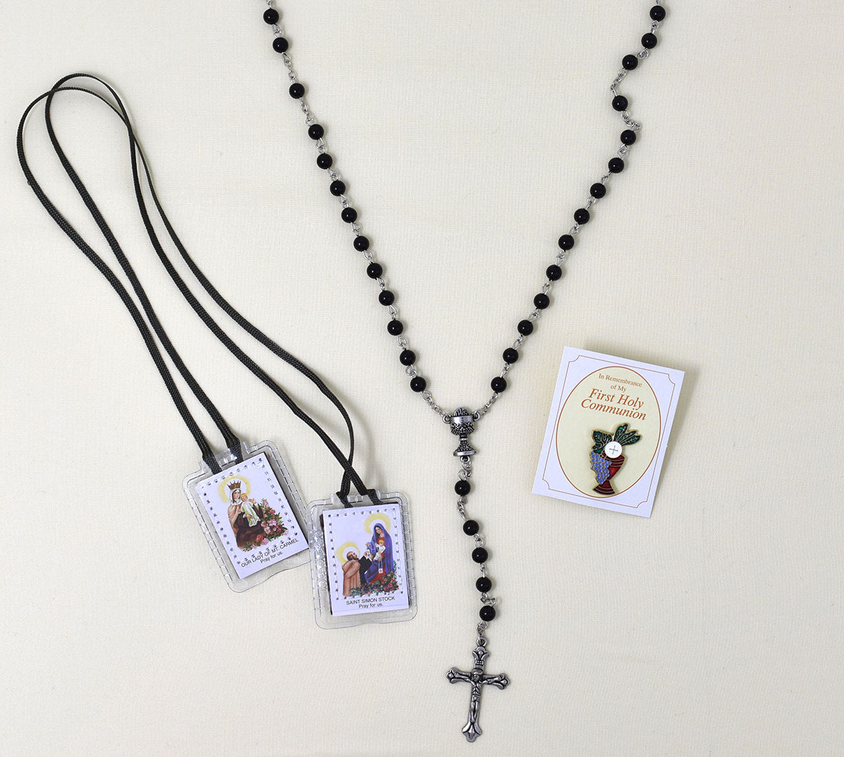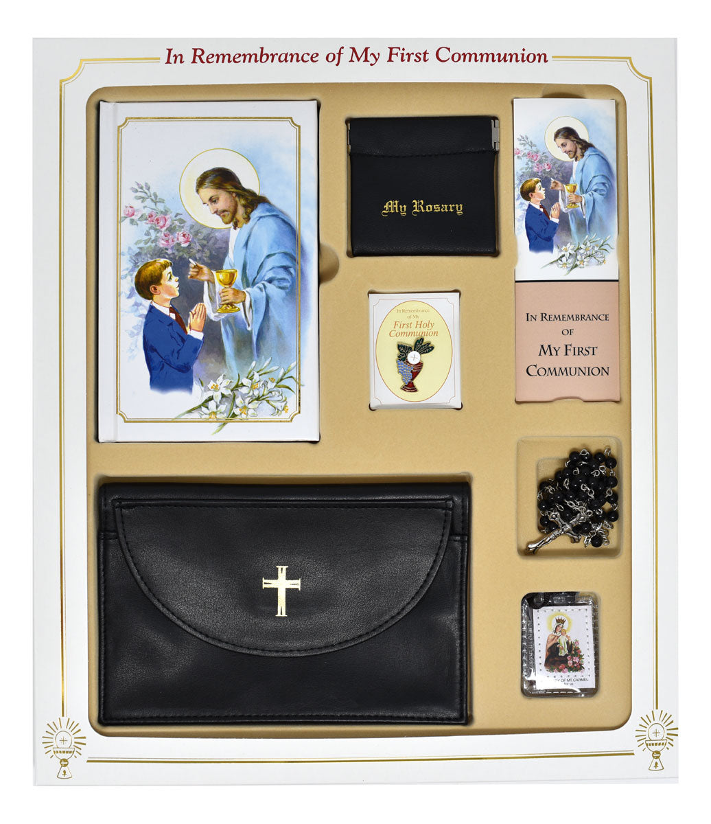 This Premier Boxed Set for boys contains a Good Shepherd Edition First Mass Book, elegant pearlized rosary, laminated scapular, enamel pin, laminated bookmark and black imitation leather wallet with gold detail and matching secure, pinch-top rosary case. Price includes shipping.